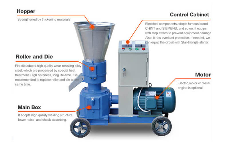 Rotating die pellet mill is the regular design in which material is pushed into the die holes as the die spins under rollers. The flat die rotates and presses rollers to move at the same time. Under this kind of composite motion, the materials can go into the compression area sufficiently and it is conducive to make feed pellets. Simple supported structure of press roller is good to resist larger deformation resistance. The advantages of this design is low electricity consumption and high efficiency in making feed pellets. This portable pellet mill can process corn, bean dregs, straw, grass and rice hull powder into granulated pellets. For different sizes of pellets, you just replace flat die with different diameters of die holes. In addition, if you want to make biomass pellets, you would better use relatively soft materials as the machine design is stationary rollers and a running die mold.